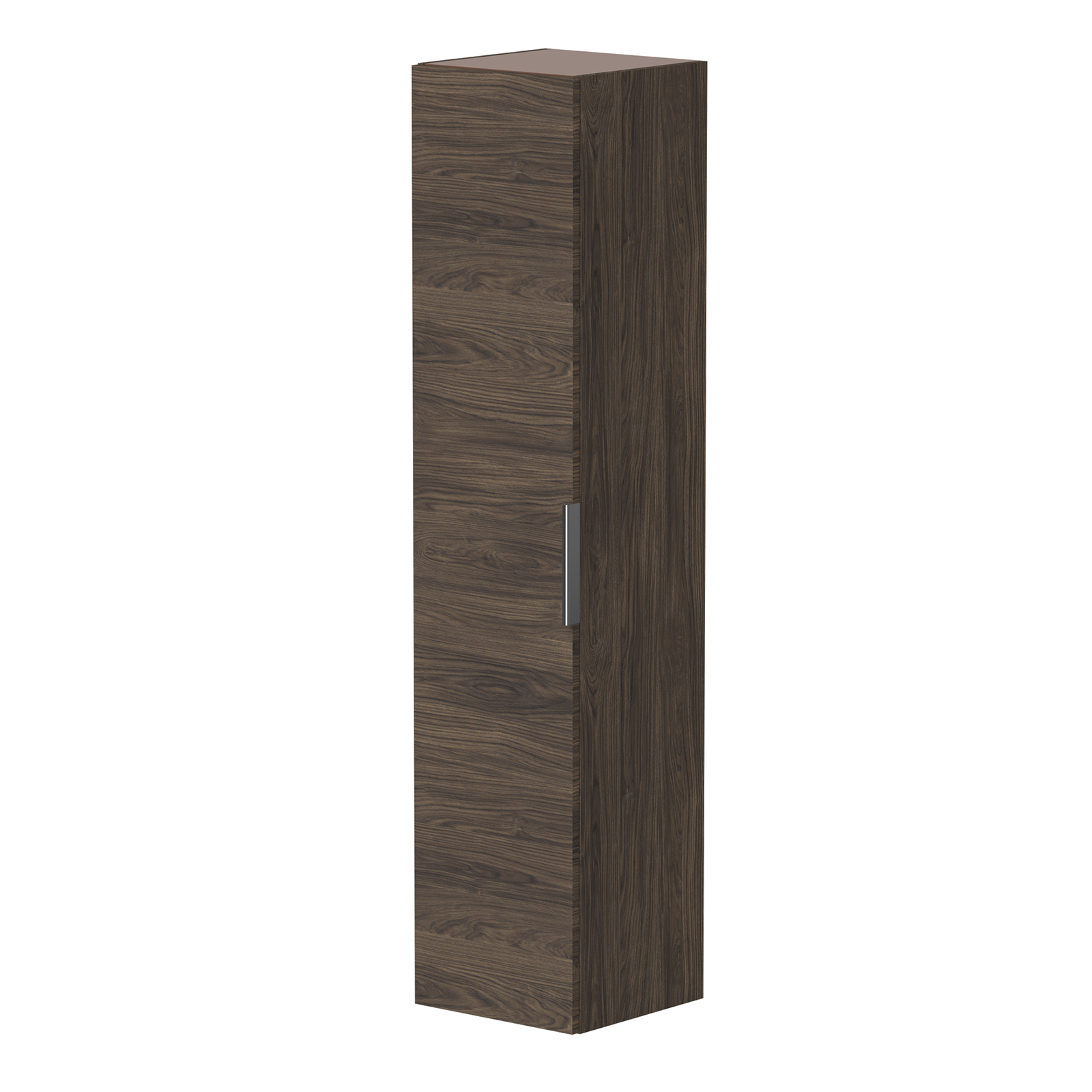 BIG høyskap i brun eik er en varm mørk trefarge gir et harmonisk baderom. Et høyskap på badet kan skaffe mye ekstra oppbevaringsplass. BIG høyskap har 3 glasshyller med valgfri plassering og en fast trehylle. Skapet har en dør og hengsler med demping. Dørene kan hengsles på både høyre og venstre side. Høyskapet har den samme grå fargen innvendig som skuffene i serien. Sort matt grep er inkludert, men grep i andre farger kan bestilles som et tilleggsprodukt.
