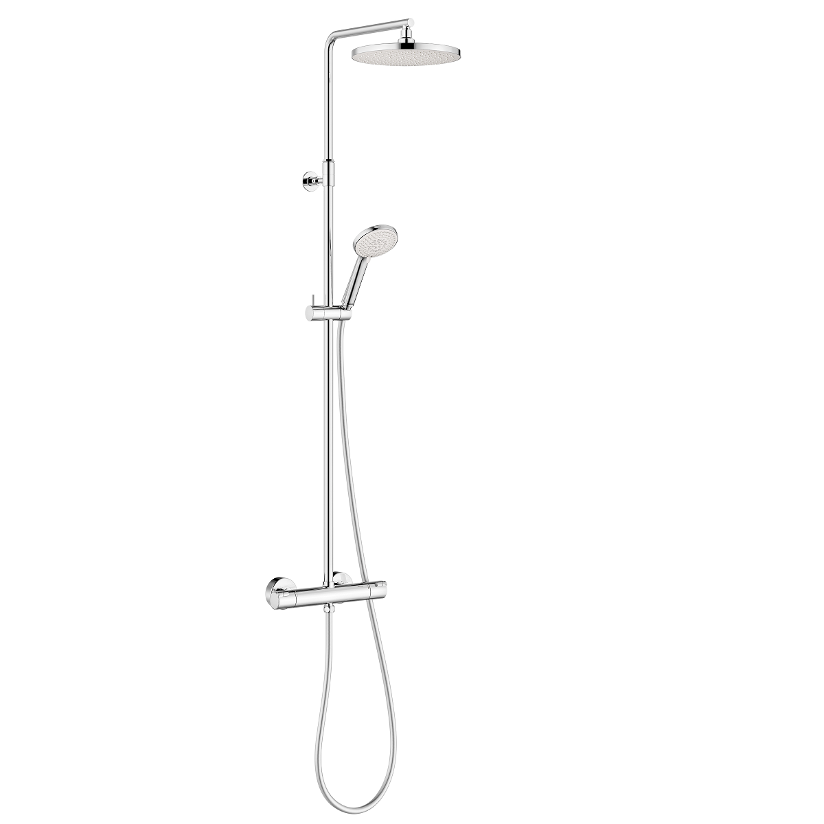 Core takdusj er en komplett takdusj med stang med fleksibel justering på høyden, håndusj med tre innstillinger, takdusjhode på 230mm og 1500mm sølvfarget glatt slange. Termostatkran med skoldesperre og grep med knapp som gjør det enkelt å endre temperatur og vannmengde. Til proffen: Vær oppmerksom på at det øvre veggfeste må strammes med unbraco i henhold til monteringsanvisning.