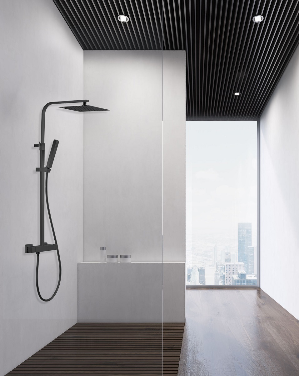 Stram takdusj med firkantet termostatkran, stang og takdusjhode. Mål: 250x250mm. Firkantet tubehånddusj - en instilling på strålen. Vender i termostat. Justerbar høyde på stang ved montering. Overflate sort matt.