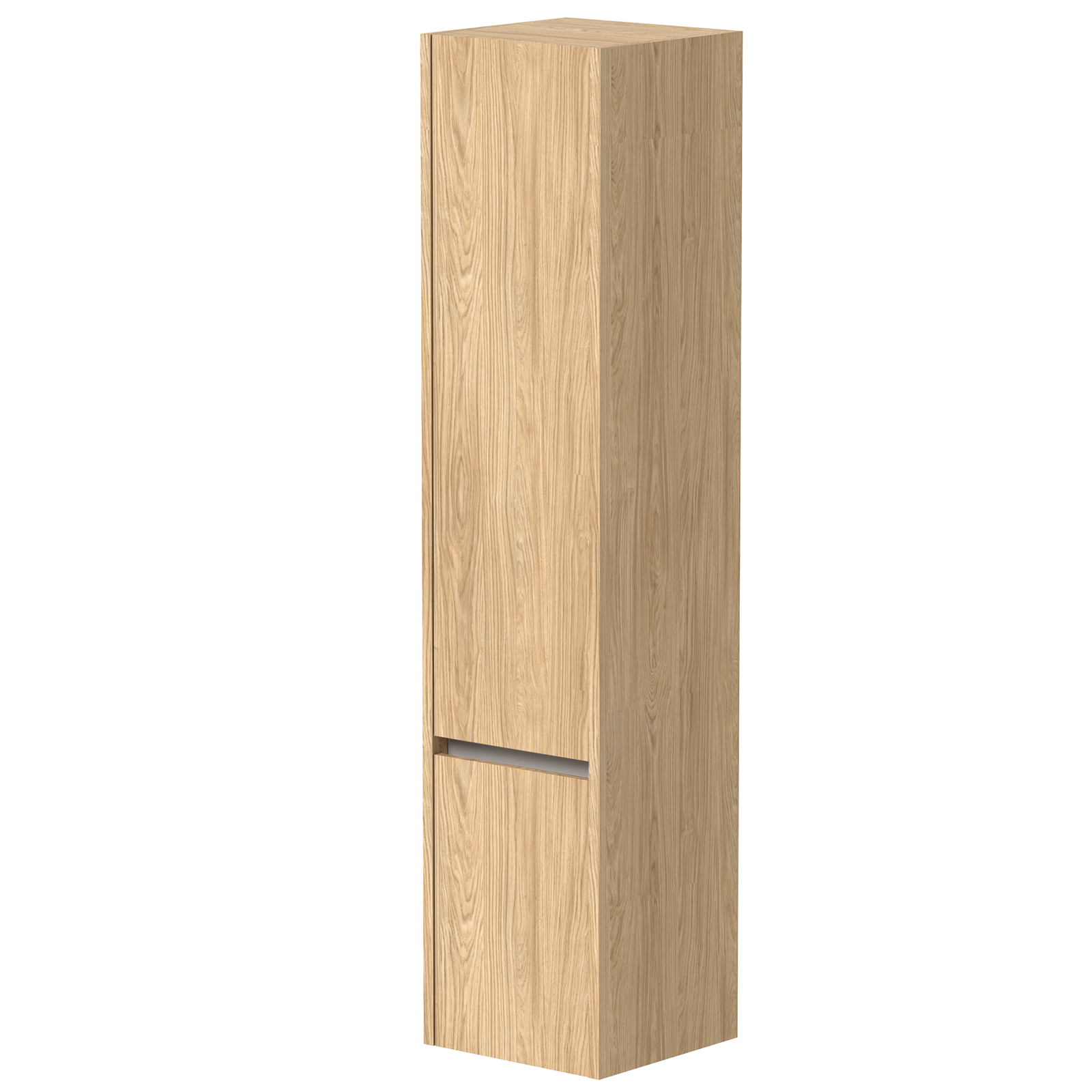 Eris høyskap i lys eik gir baderommet et tidløst, lyst og naturlig uttrykk - perfekt for det skandinaviske baderommet. Overflaten i lys eik er perfekt for nordiske baderom for et rolig og harmonisk uttrykk. Aluminiumsfargede lister mellom de grepsfrie dørene fremhever skapets moderne design og gir en subtil lys kontrast til den lyse eikefargen. Med justerbare hengsler for høyre- eller venstremontering kan skapet enkelt tilpasses ditt rom. Innsiden byr på tre glasshyller som kan plasseres etter eget ønske, og en fast trehylle i laminert MDF, som gir god stabilitet og allsidig oppbevaringsplass. Aluminiumslister i hvit og sort kan kjøpes separat.