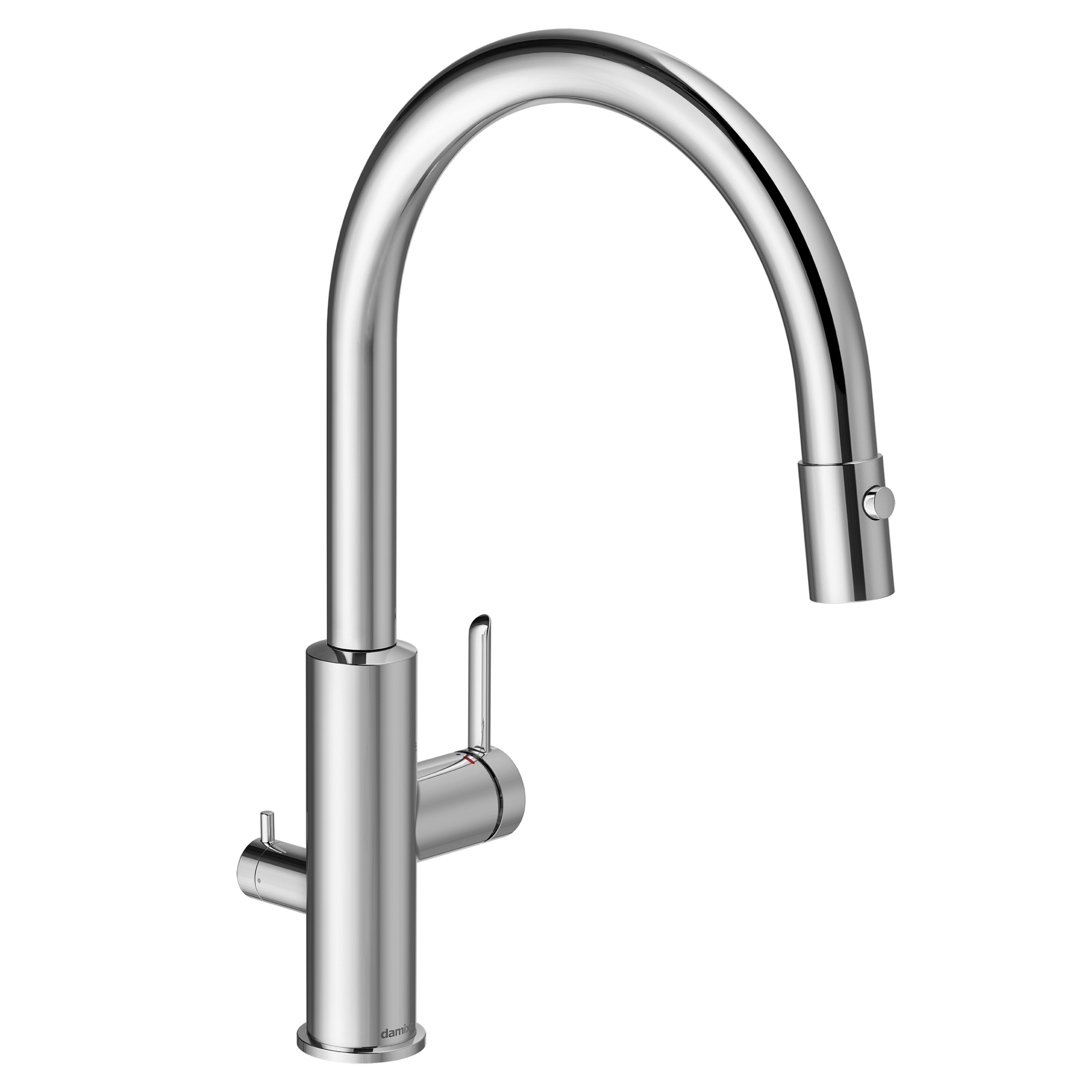 Iris i krom har et klassisk og tidløst uttrykk. Kranen har uttrekkbar tut med både vanlig stråle og dusjfunksjon, ideell til oppvask og rengjøring av hele kummen. Avstengingen for oppvaskmaskin er elegant plassert på baksiden slik at den ikke bryter med designet.