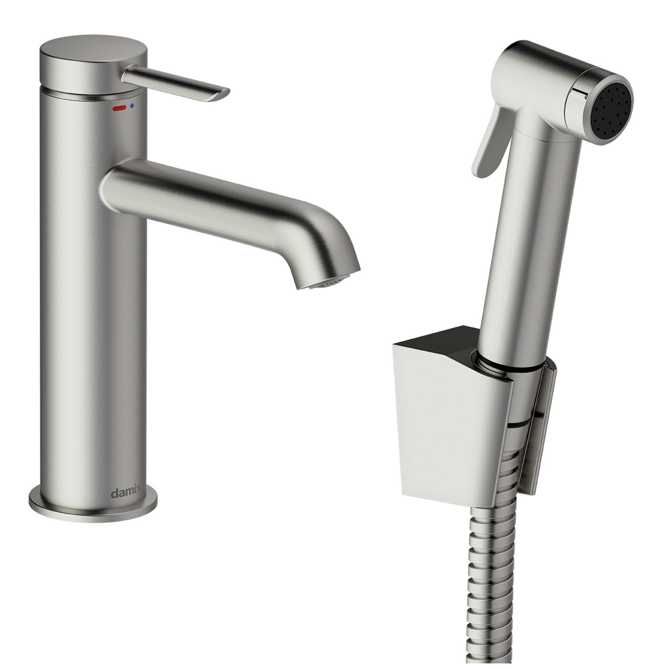 Iris servantkran med sidedusj i børstet stål har et dempet metallskjær som gir et moderne og eksklusivt preg. Overflaten er PVD-behandlet for ekstra slitestyrke og lang levetid. Kranen leveres med veggbrakett og sidedusj i samme overflate for et helhetlig uttrykk.