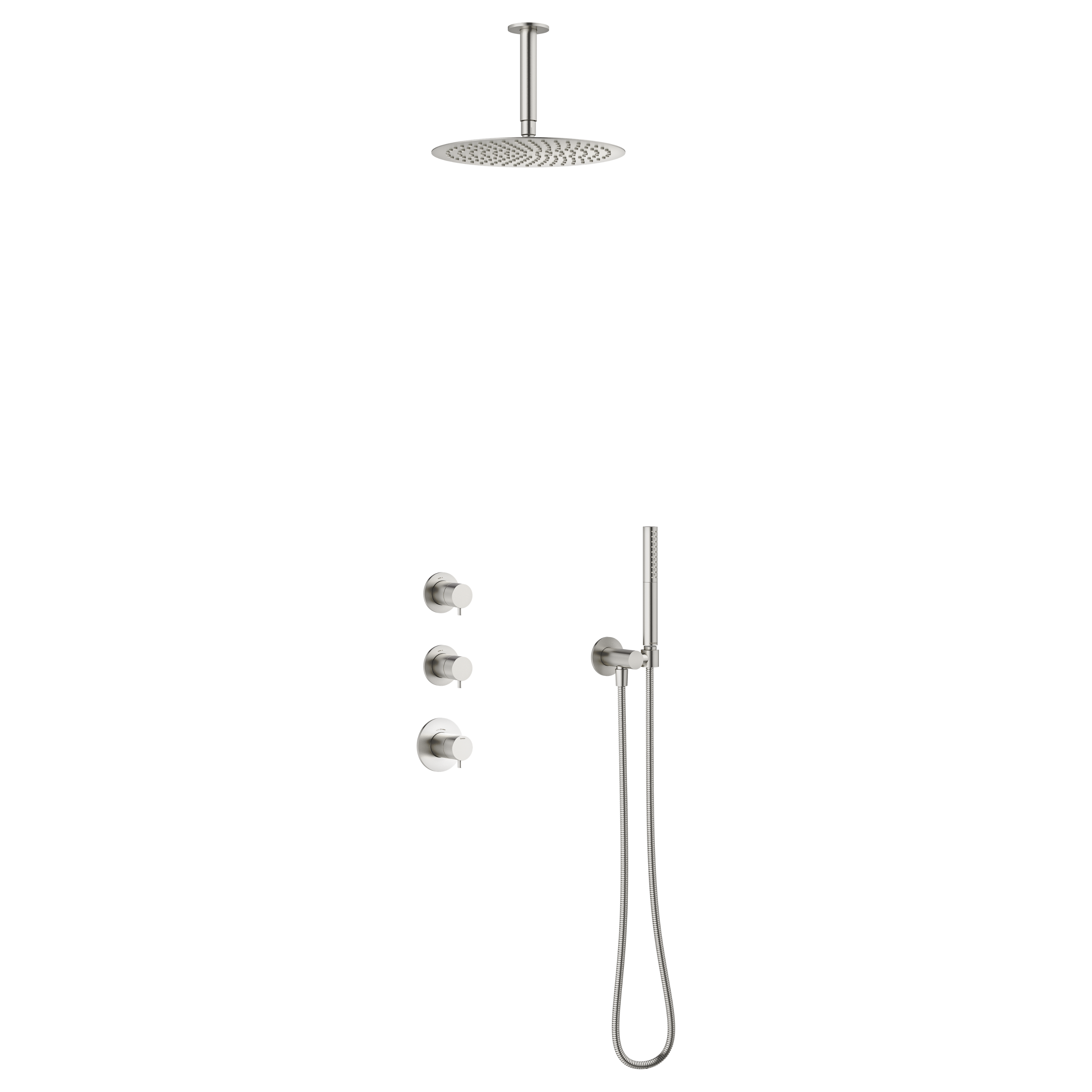 Iris XS2 takdusj for innbygging i børstet stål har et sobert og eksklusivt uttrykk. Den PVD-behandlede overflaten beskytter mot slitasje og oksidering. Takdusjhodet på Ø300 mm har rub-clean og sparedyse, og hånddusjen har tre stråletyper – inkludert Mist. Betjenes med tre separate ratt for temperatur, vannmengde og dusjvalg. Med takmontert dusjarm. NB! Dette er kun synlige deler. Sikkerhetsboks, innvendig del for XS1/XS2 og siklemikk må kjøpes separat for komplett takdusj for innbygging.