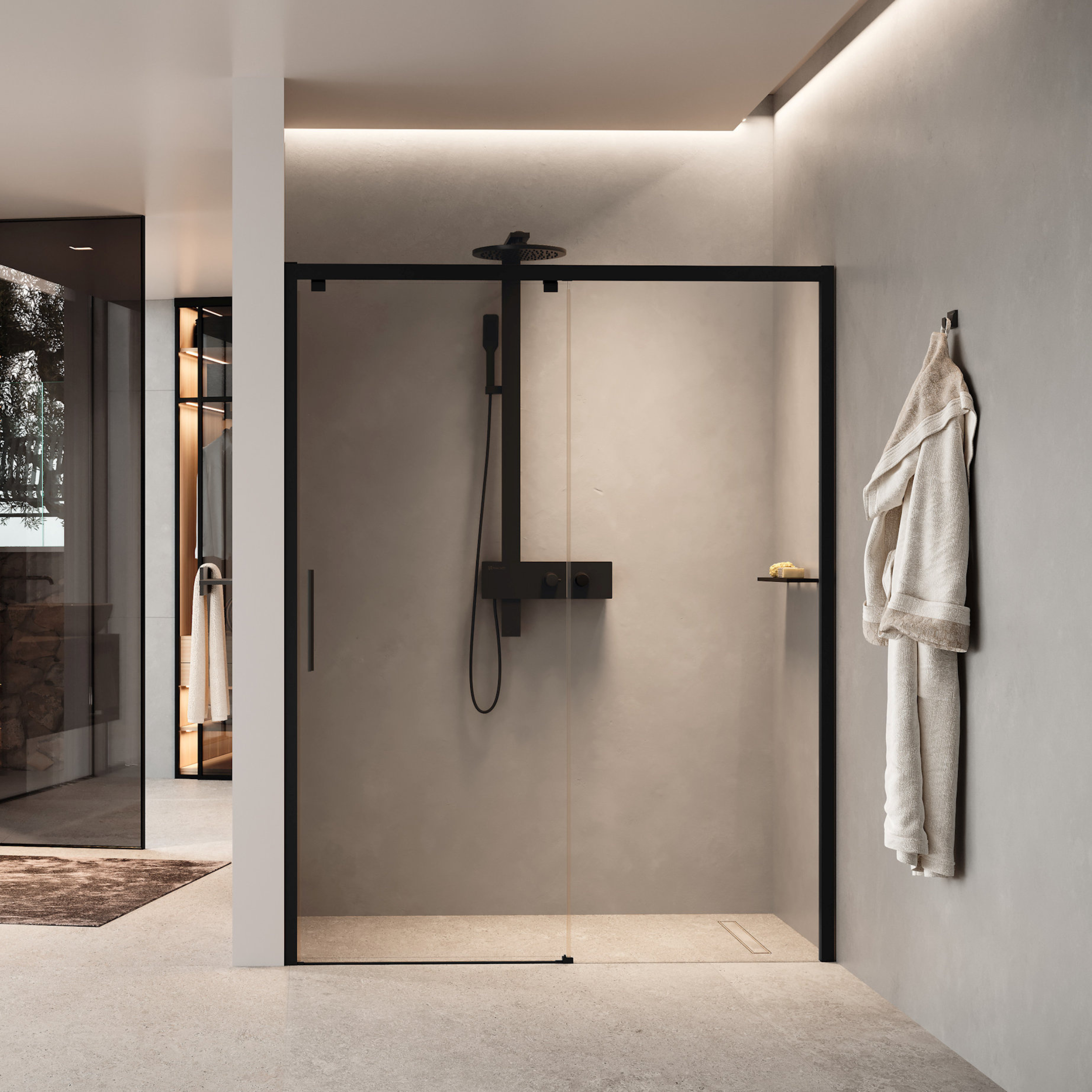 Skyvedør med soft-close og sorte profiler for montering i nisje. Justerbart monteringsmål fra 147-151cm