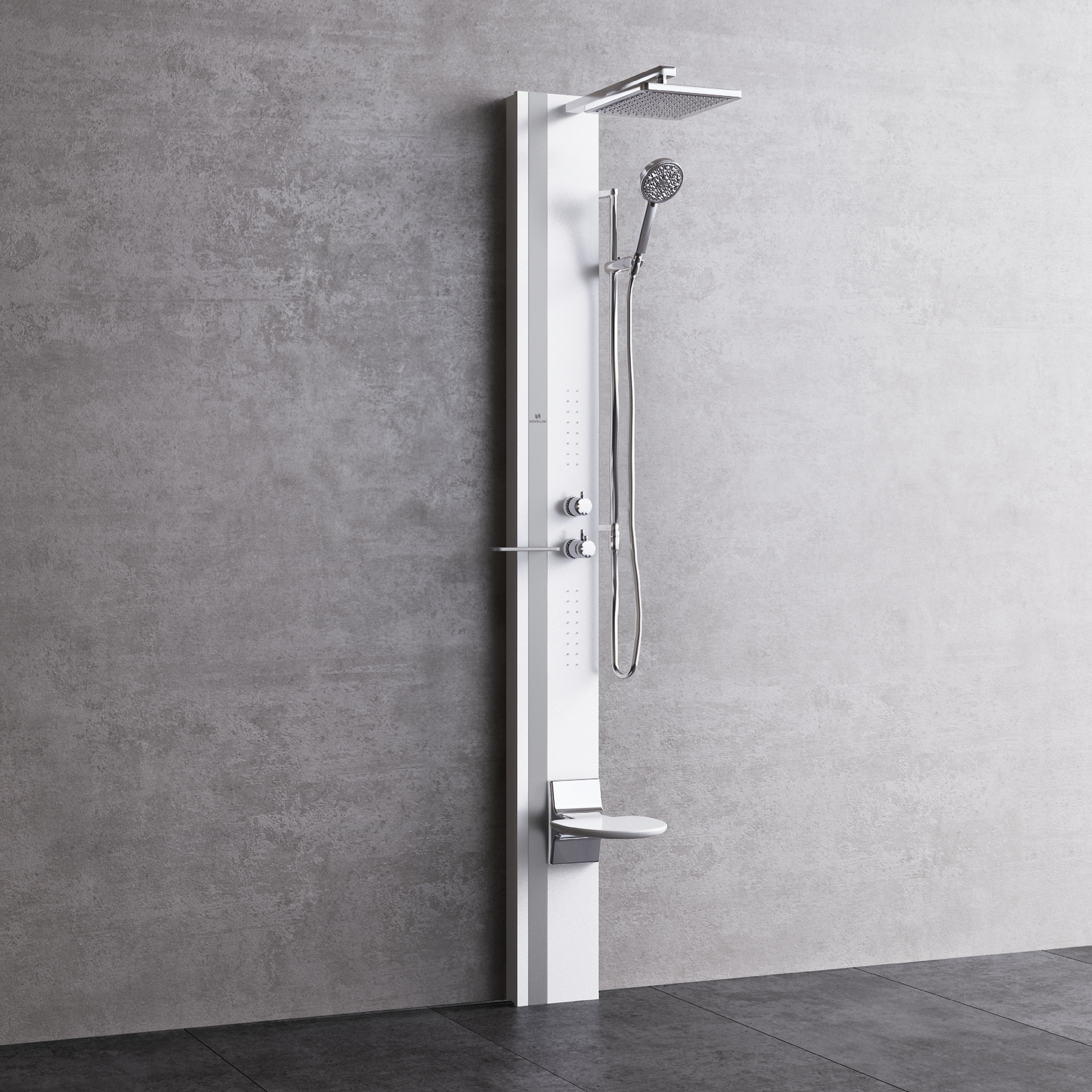 Dusjsøyle fra Novellini med både hånddusj og takdusj. Kan også monteres i hjørne, noe som gjør denne perfekt for deg som ønsker å bytte fra dusjkabinett. OBS! Bildet er vist med massasjedyser og sete. Dette medfølger ikke på standard modell.