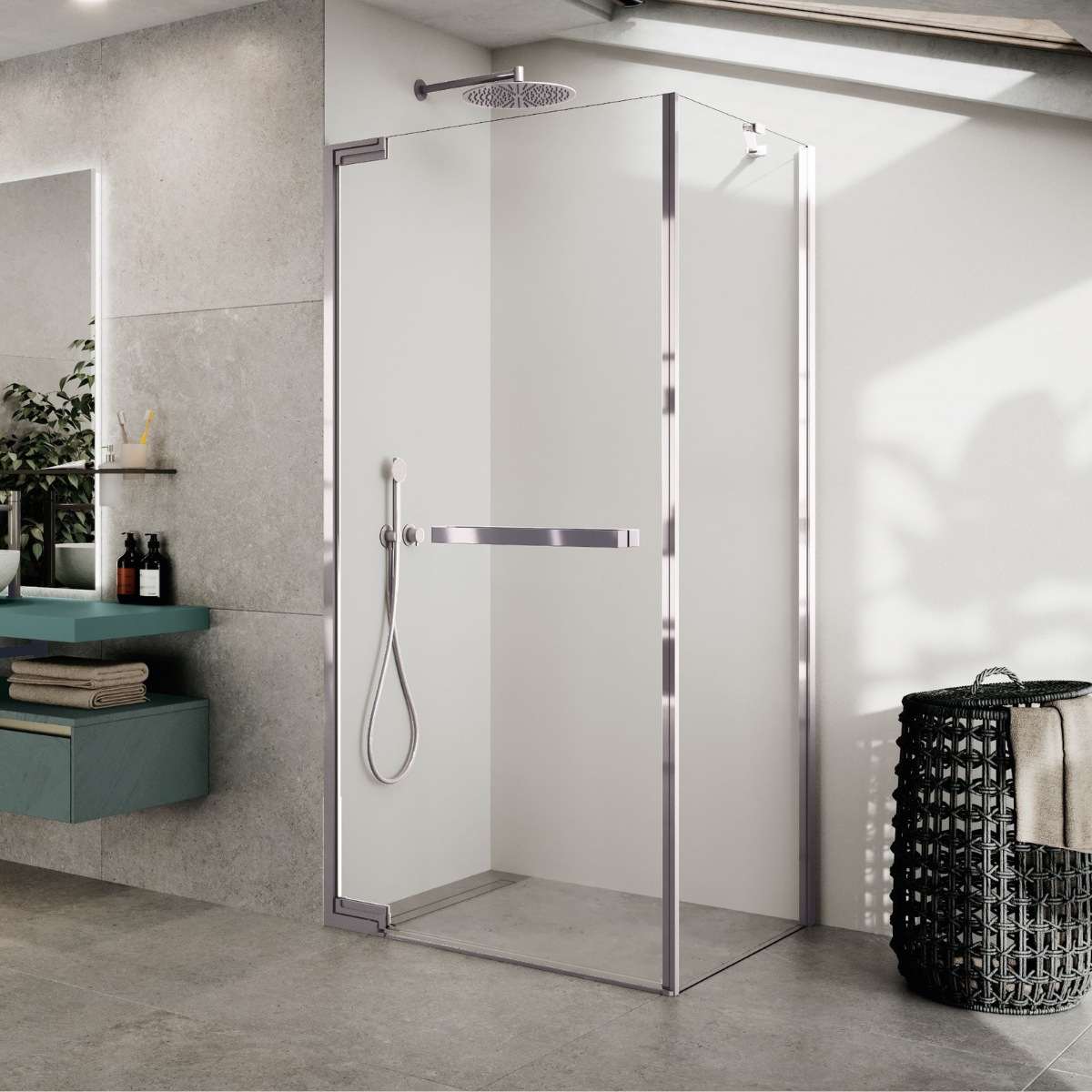 N180 dusjvegg kombinerer prisvinnende design med enestående funksjonalitet og bærekraft. Denne dusjveggen er ideell for deg som ønsker et dusjhjørne med eksklusive detaljer, inkludert dempelukking på døren, ekstra tykt glass, og delikate farger på de elegante profilene. Den eksklusive slagdøren for hjørnemontering har en 90-graders lukkemekanisme med soft-close, som sikrer en stille og jevn lukking når døren nærmer seg lukkeposisjon. Den skjulte magnetiske lukkemekanismen gir et rent og moderne utseende. Kun til kombinasjon med sidefastfelt (N180F).