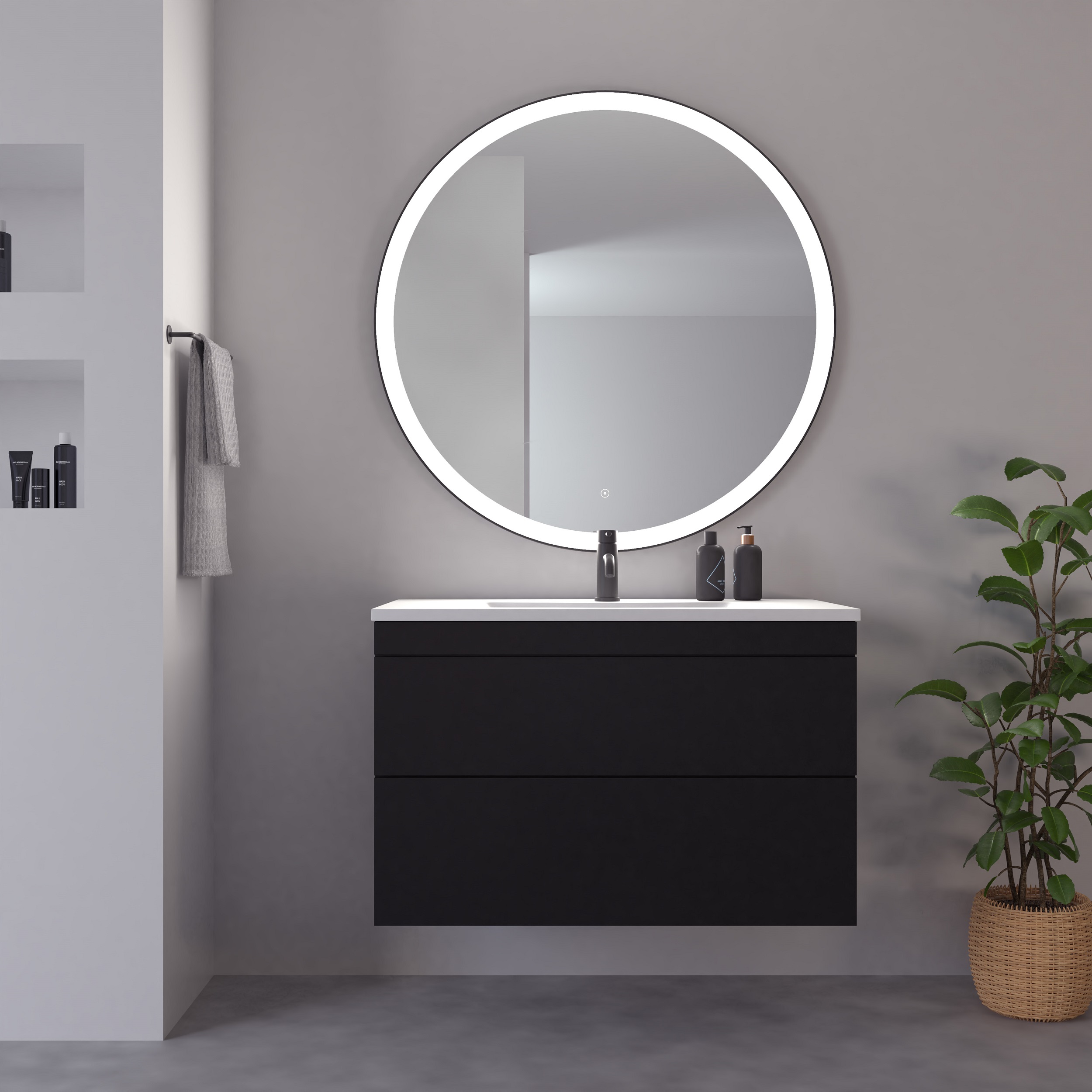 Nyborg er et lekkert rundt speil med sort aluminiumsramme og frostet lyslist. Lyset kan dimmes med berøringsknappen på fremsiden av speilet. Nyborg gjør seg godt mot andre sorte detaljer på badet.
