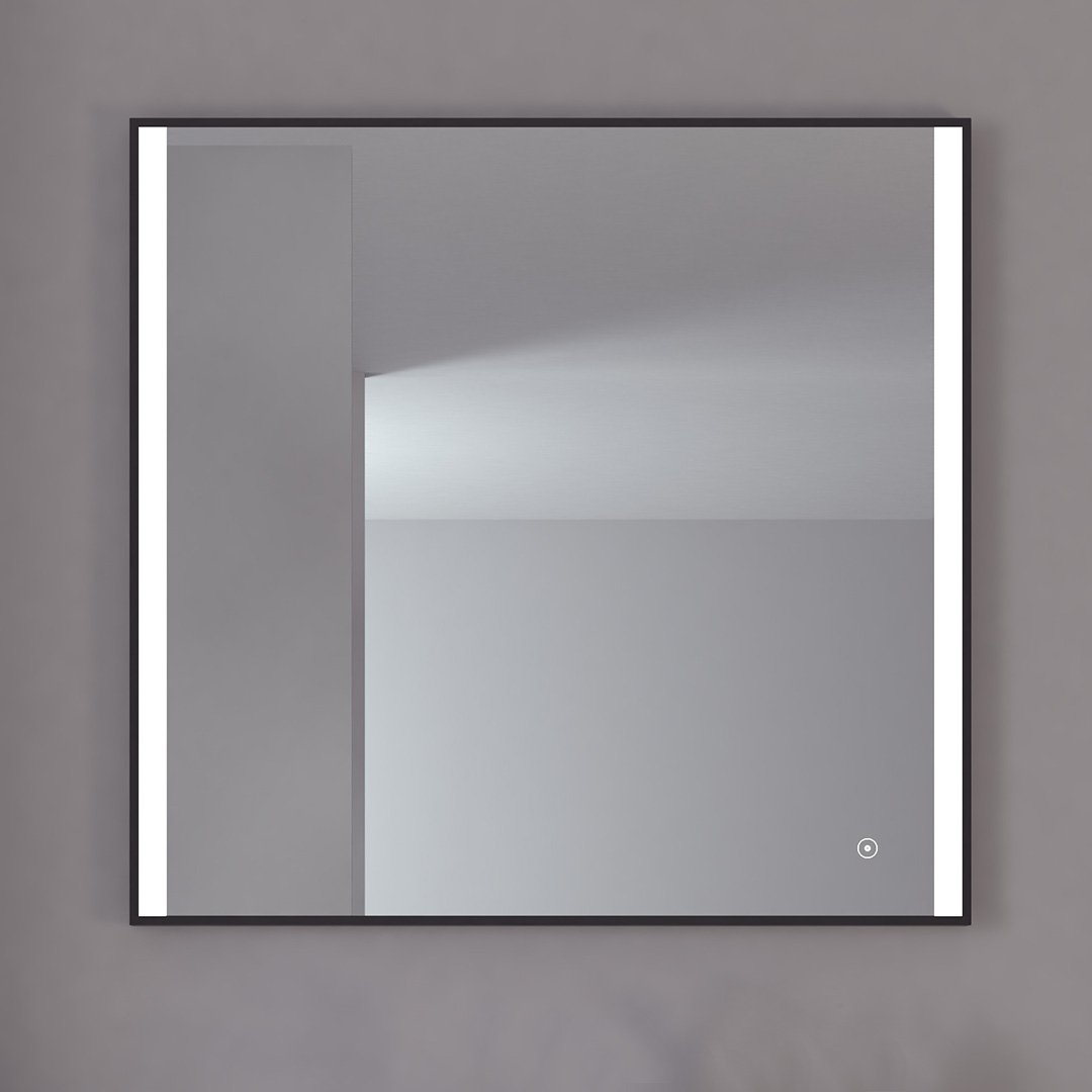 Lekker minimalistisk speil med frostet sidelys. Speilet kan dimmes med knappen på speilet. Med sort ramme i aluminium gir speilet et elegant inntrykk med stramme linjer som passer fint til en sofistikert stil.