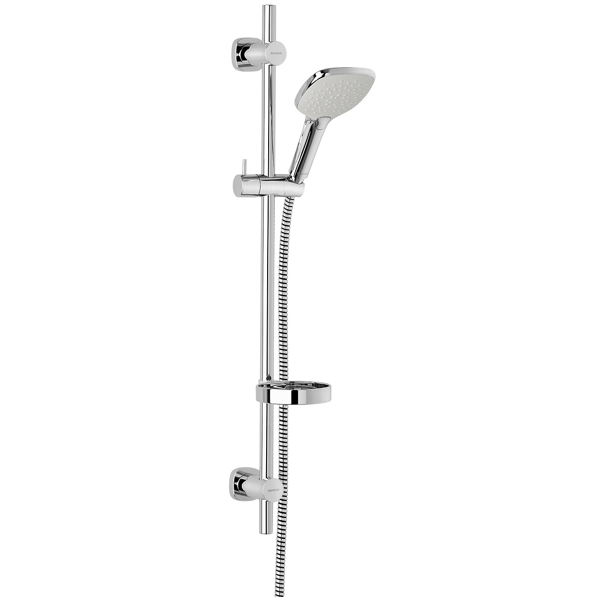 dusjgarnityr med fleksibelt veggfeste, maks avstand 740mm. Tre innstillinger på stråle. Sparedyse i hånddusj som enkelt kan fjernes.