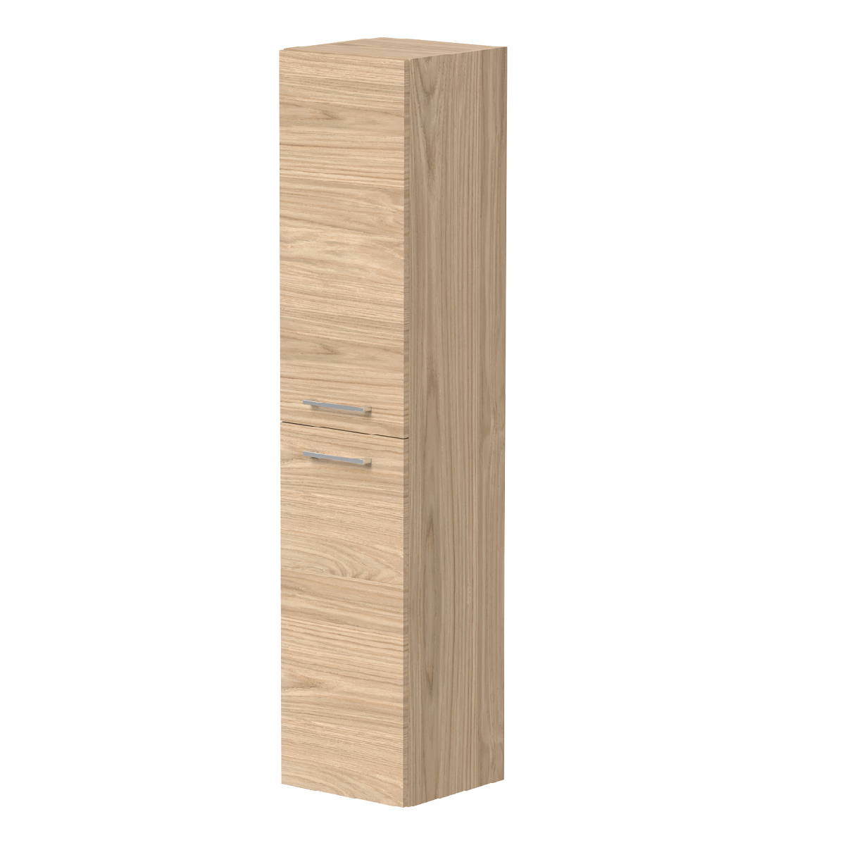 Med overflate i lys eik får du et lyst og naturlig inntrykk på badet, som også kan spille på lag med de fleste overflater. Høyskapet har to dører og glasshyller du kan plassere fritt slik at du kan oppbevare baderomstilbehøret som det passer deg.