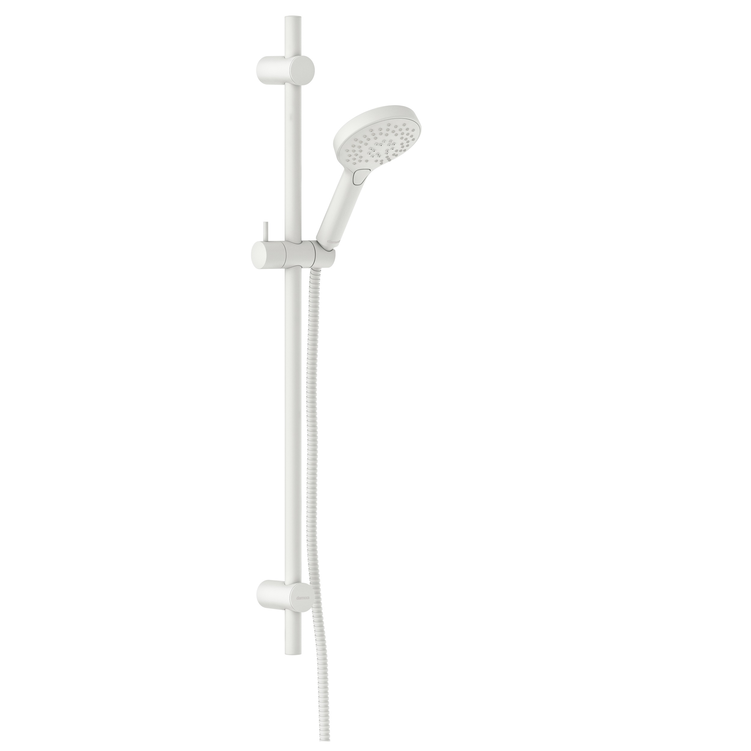 Dusjgarnityr med fleksibelt veggfeste, maks avstand 740mm. Tre innstillinger på stråle. Sparedyse i hånddusj som enkelt kan fjernes.Gir 9l vann pr minutt. Hvit matt.