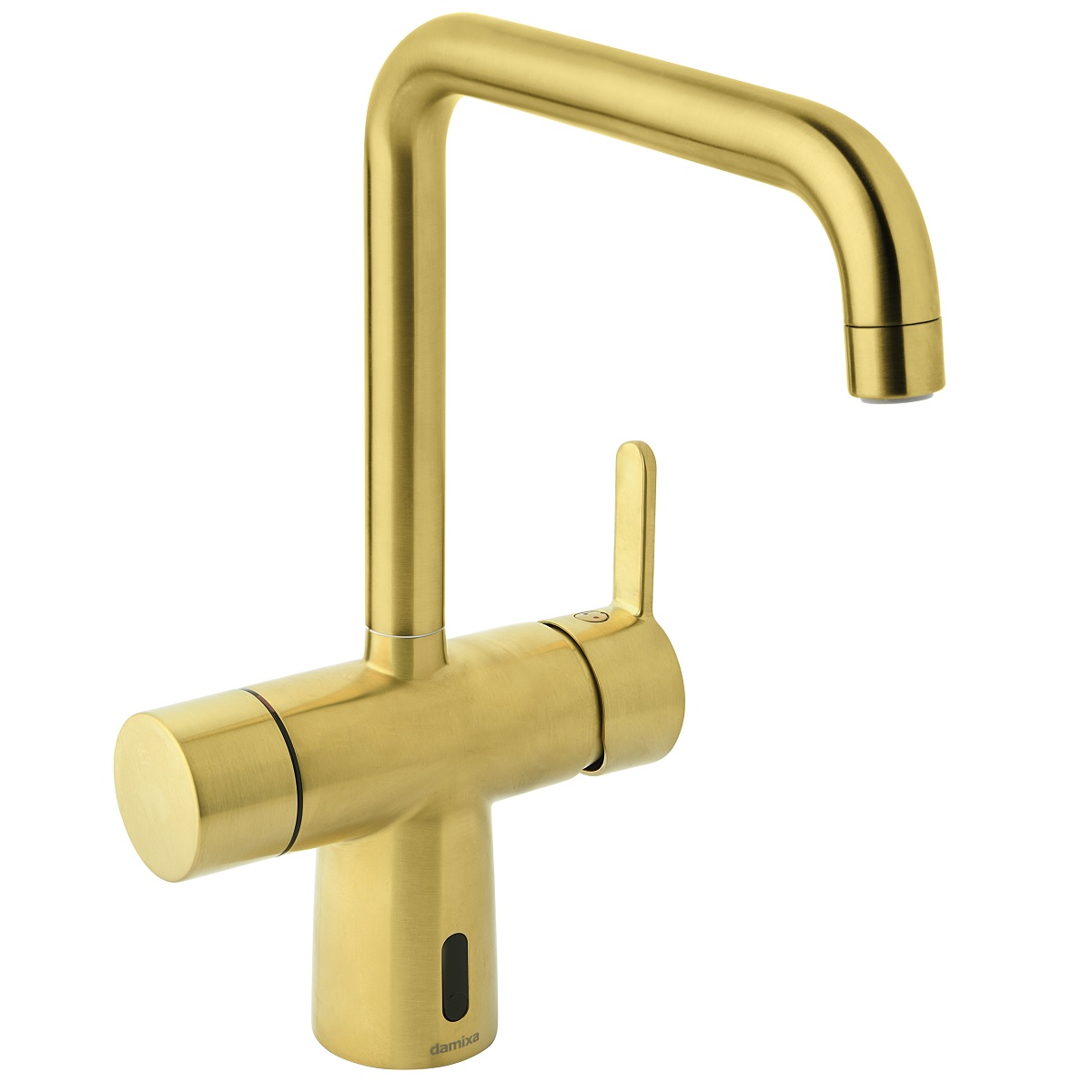 Sensorstyr kjøkkenkran kombinert med muligheter for manuell bruk av hendel. Enkel justering av styrke og temperatur på vann. Børstet messing i PVD overflate.