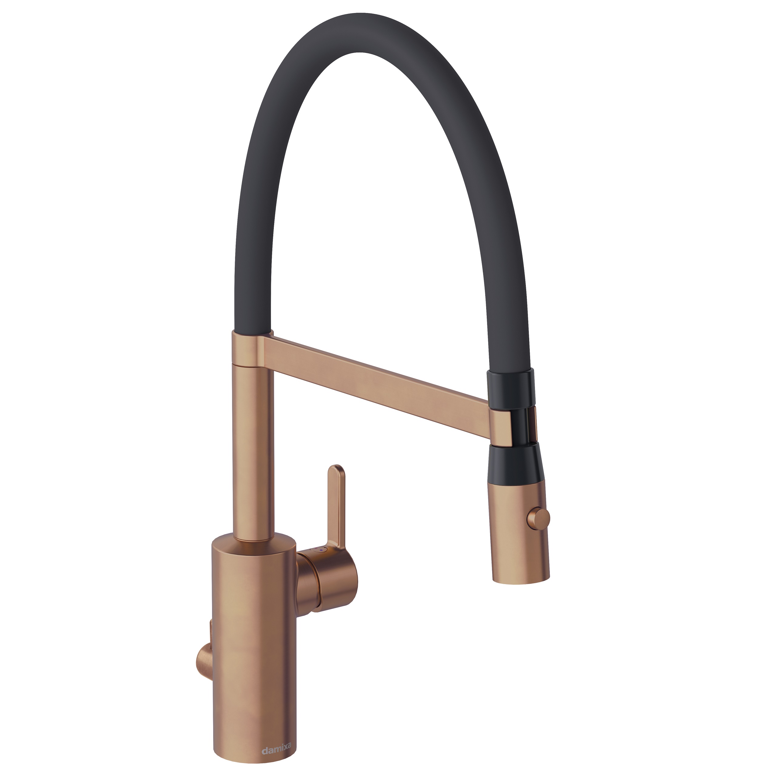 Kjøkkenkran med fleksibel sort slange og avstengning for oppvaskmaskin. 120 grader svingbegrensning.Velg mellom vanlig stråle og dusjstråle. 8 liter vann pr min. Kaldstart. Børstet kobber (PVD)