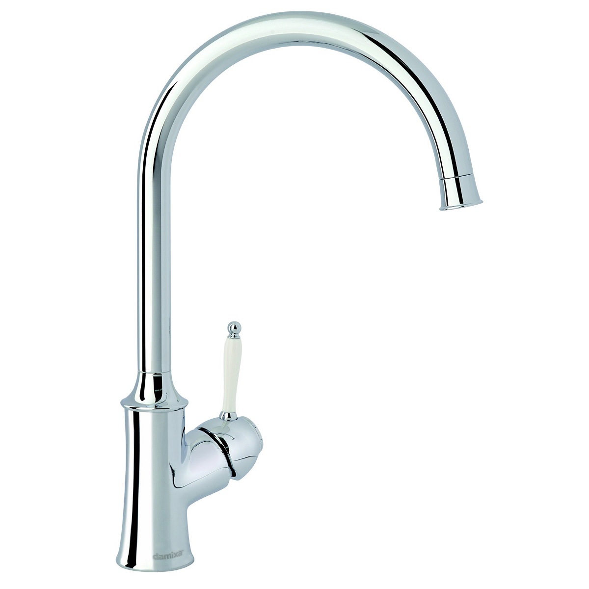 Nostalgisk kjøkkenkran med moderne funksjoner. Ettgreps kran med eco-save og skoldesperre.