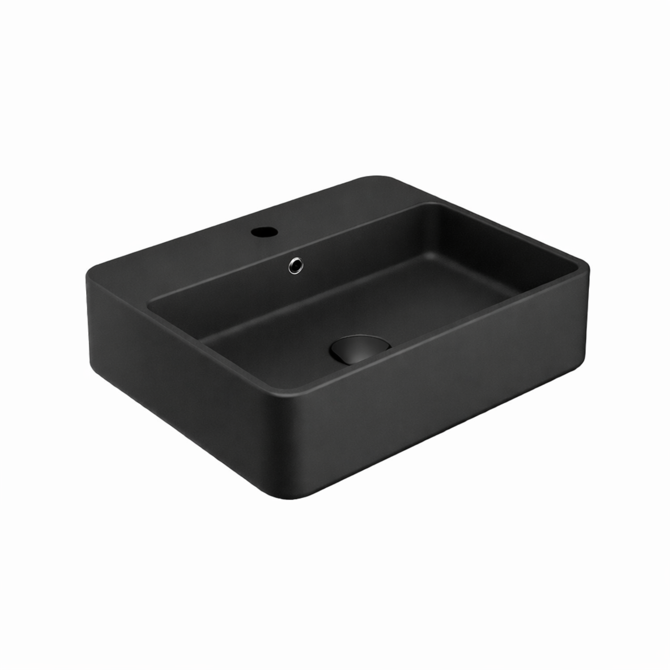 Vegghengt servant i sort matt porselen gir et tydelig og solid uttrykk til baderommet. Den rektangulære formen med avrundede hjørner balanserer det stramme designet, og gjør at servanten fungerer godt i både moderne og mer klassiske miljøer. Den matte overflaten demper refleksjoner og bidrar til et roligere uttrykk, samtidig som den skaper kontrast mot lysere omgivelser. Servanten har overløp og kranhull.
