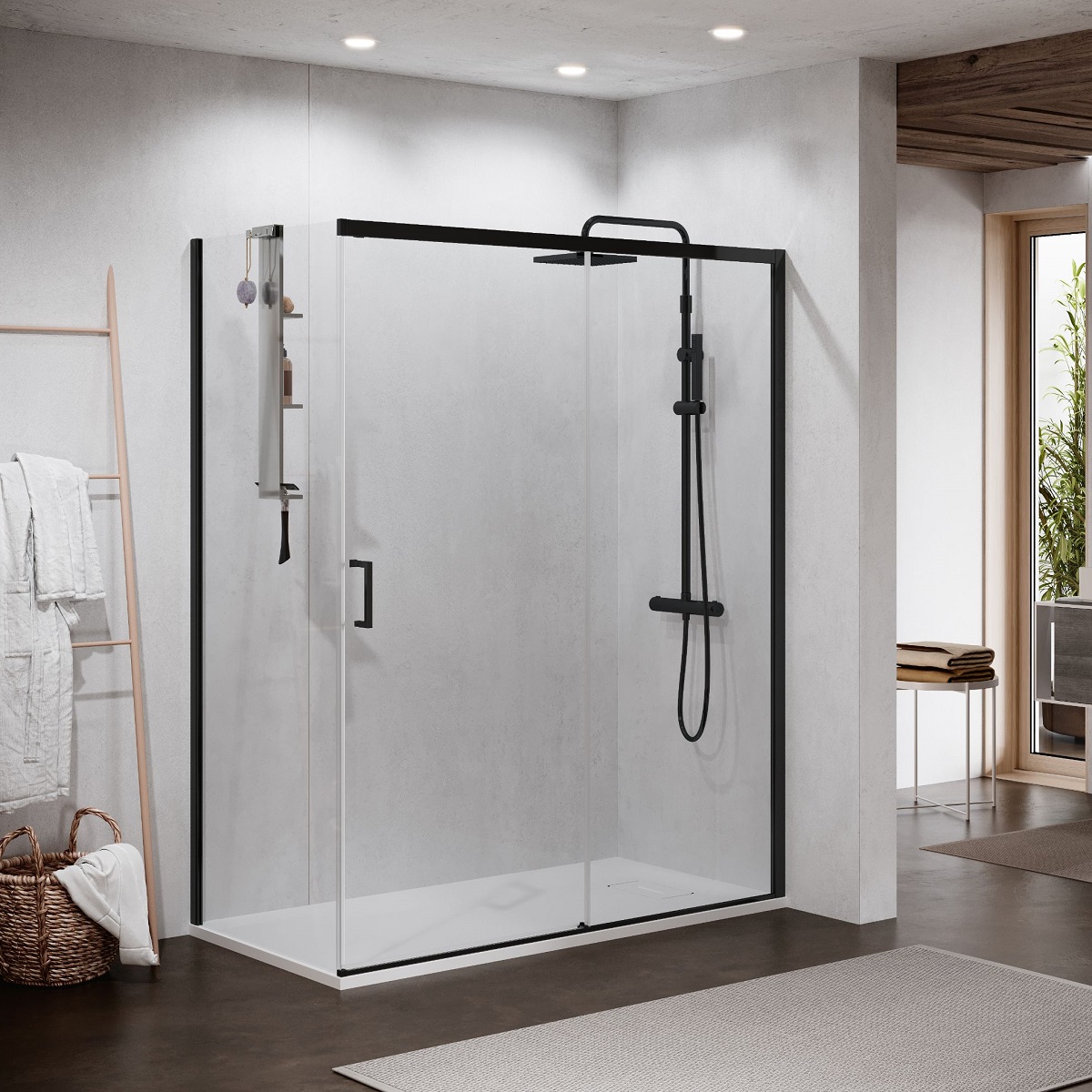 En praktisk skyvedør som kan monteres i nisje eller som hjørneløsning. Her får du en romslig dusjsone i bredde mellom 96 og 169cm, skyvedøren bestilles med åpning mot venstre eller høyre. Smarte fester nederst på døren som klikkes av før rengjøring. Høyrestilt modell betyr at profilen og det faste feltet monteres på høyre side. Da skyves døren mot høyre for å åpne sett fra utsiden.