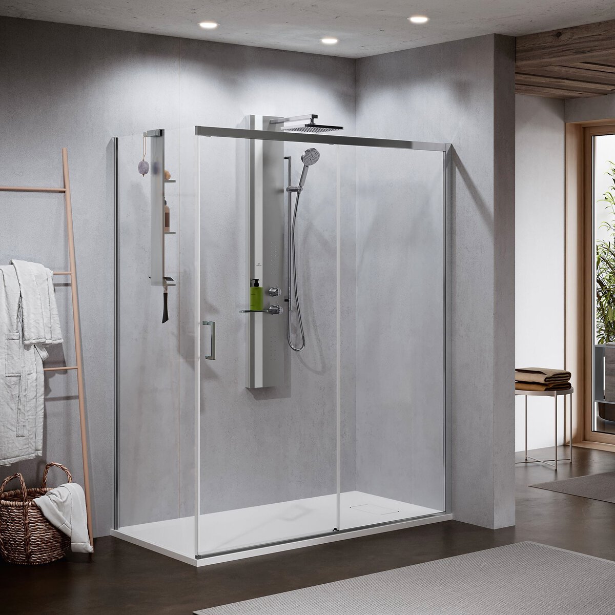 En praktisk skyvedør som kan monteres i nisje eller som hjørneløsning. Her får du en romslig dusjsone i bredde mellom 96 og 169cm, skyvedøren bestilles med åpning mot venstre eller høyre. Smarte fester nederst på døren som klikkes av før rengjøring. Venstrestilt modell betyr at profilen og det faste feltet monteres på venstre side. Da skyves døren mot venstre for å åpne sett fra utsiden.