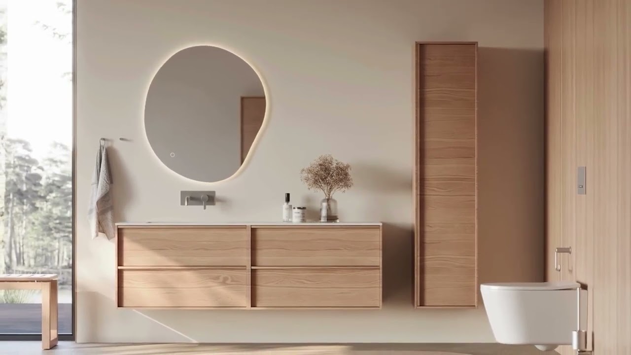 For å fullføre det tidløse minimalistiske utseendet på ditt baderom, kan du legge til noen nøye utvalgte interiørprodukter som både fremhever stilen og tilfører funksjonalitet. Velg et speil med integrert belysning i en enkel, rammefri design for å forsterke rommets lys og romfølelse. Vi har valgt et organisk speil, som gir mye med sine myke former og behagelige lys.